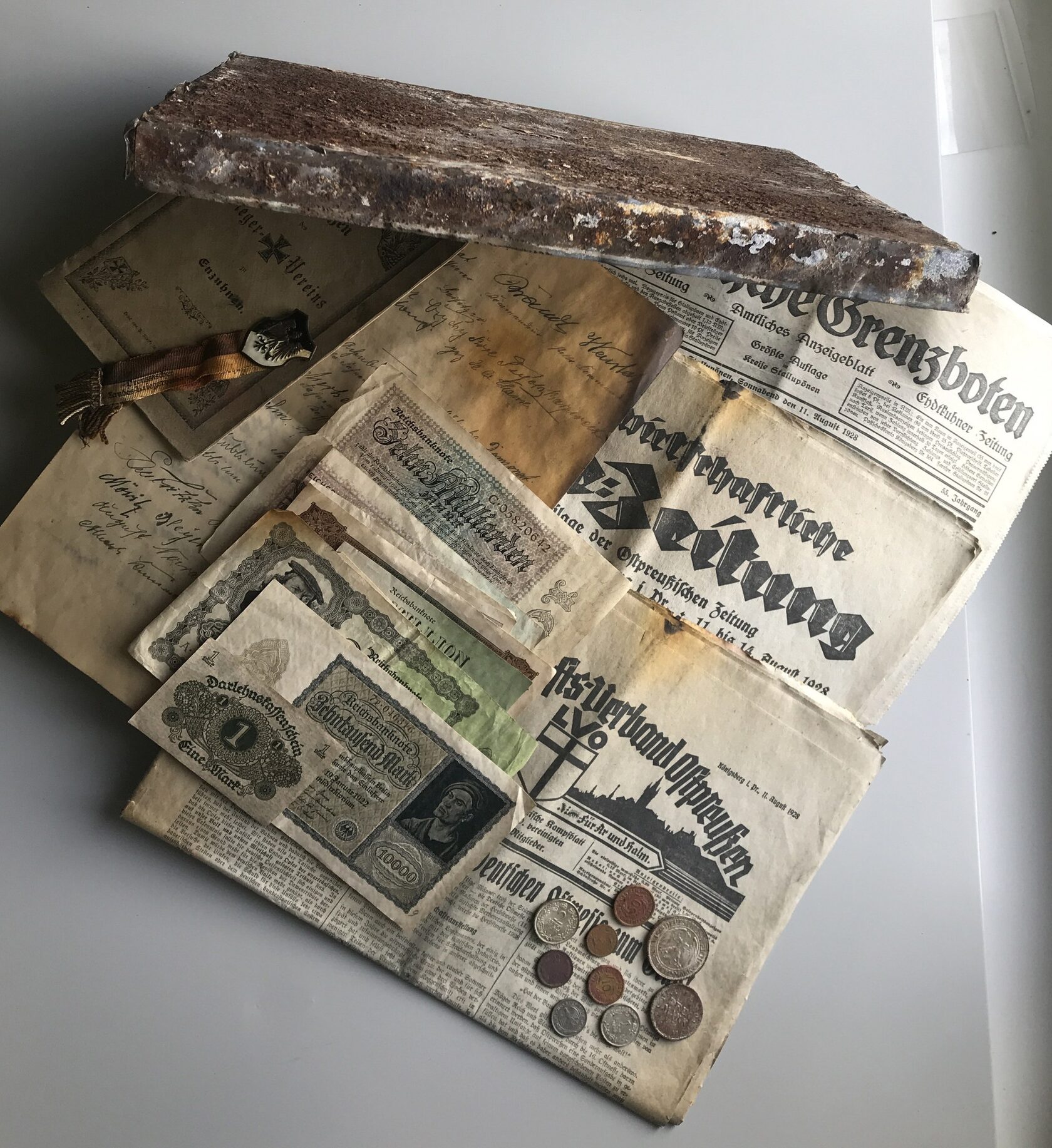 Находка была обнаружена волонтерским движением во время работ по благоустройству территории на одном из воинских захоронений в пос. Чкалово Нестеровского района. В металлическом ящике – рукописное письмо, частично пострадавшее от влаги, именное посвящение в члены Воинского объединения Энцунен, значок Воинского объединения Энцунен-Тракенен, несколько немецких и восточно-прусских патриотических газет. Также в ящике был обнаружен набор банкнот и монет номиналом от 50 пфеннигов до 10 млрд немецких марок эпохи Веймарской республики (1919-1933 гг.), в том числе одна местная банкнота, выпущенная в Шталлупёнене (ныне – город Нестеров).